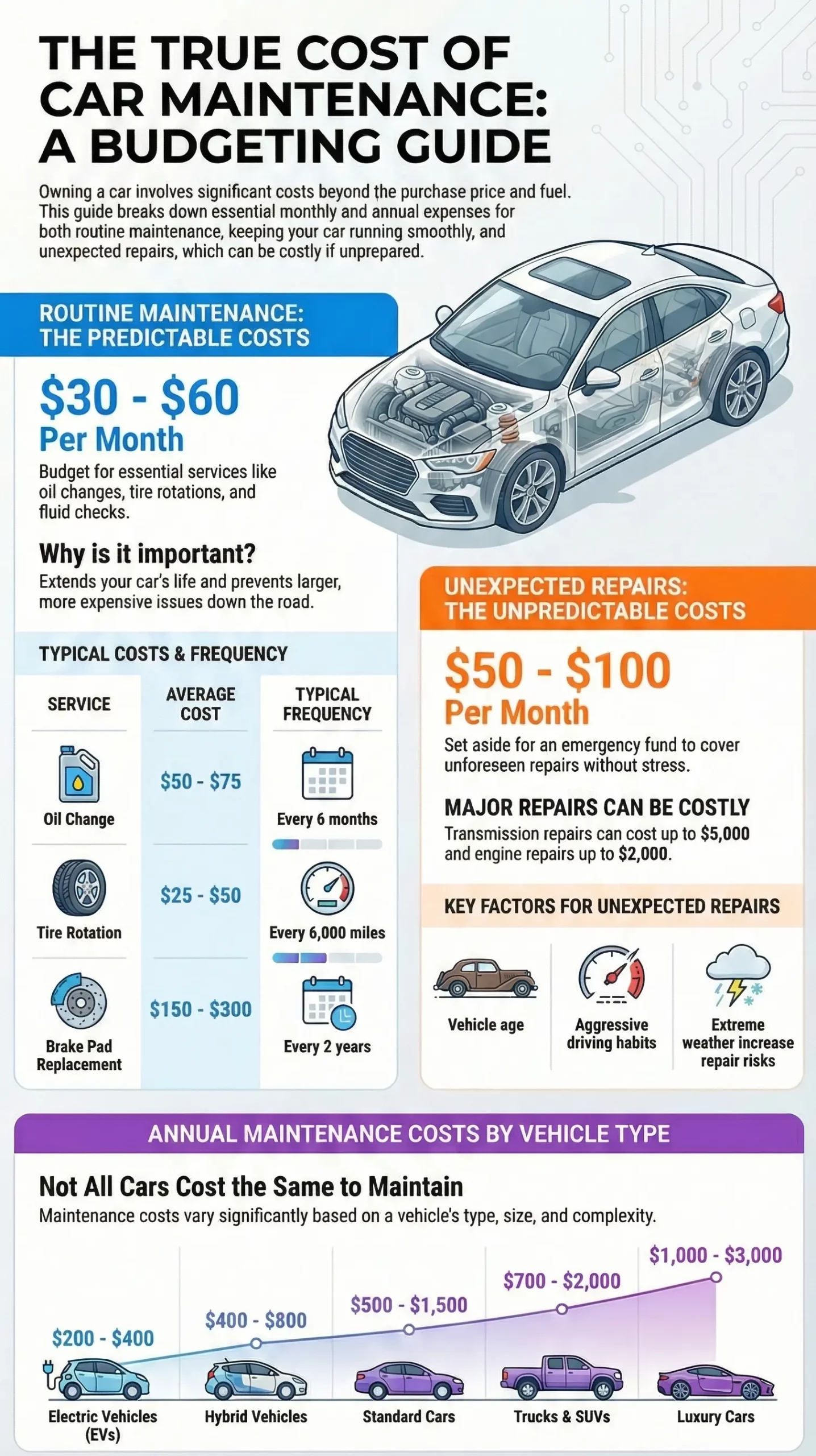 On average, you should budget between $30 and $60 per month for routine car maintenance, including oil changes, tire rotations, and fluid checks. However, this can vary based on your car’s make, model, and age. For unexpected repairs, it’s wise to set aside $50 to $100 per month in an emergency fund.
