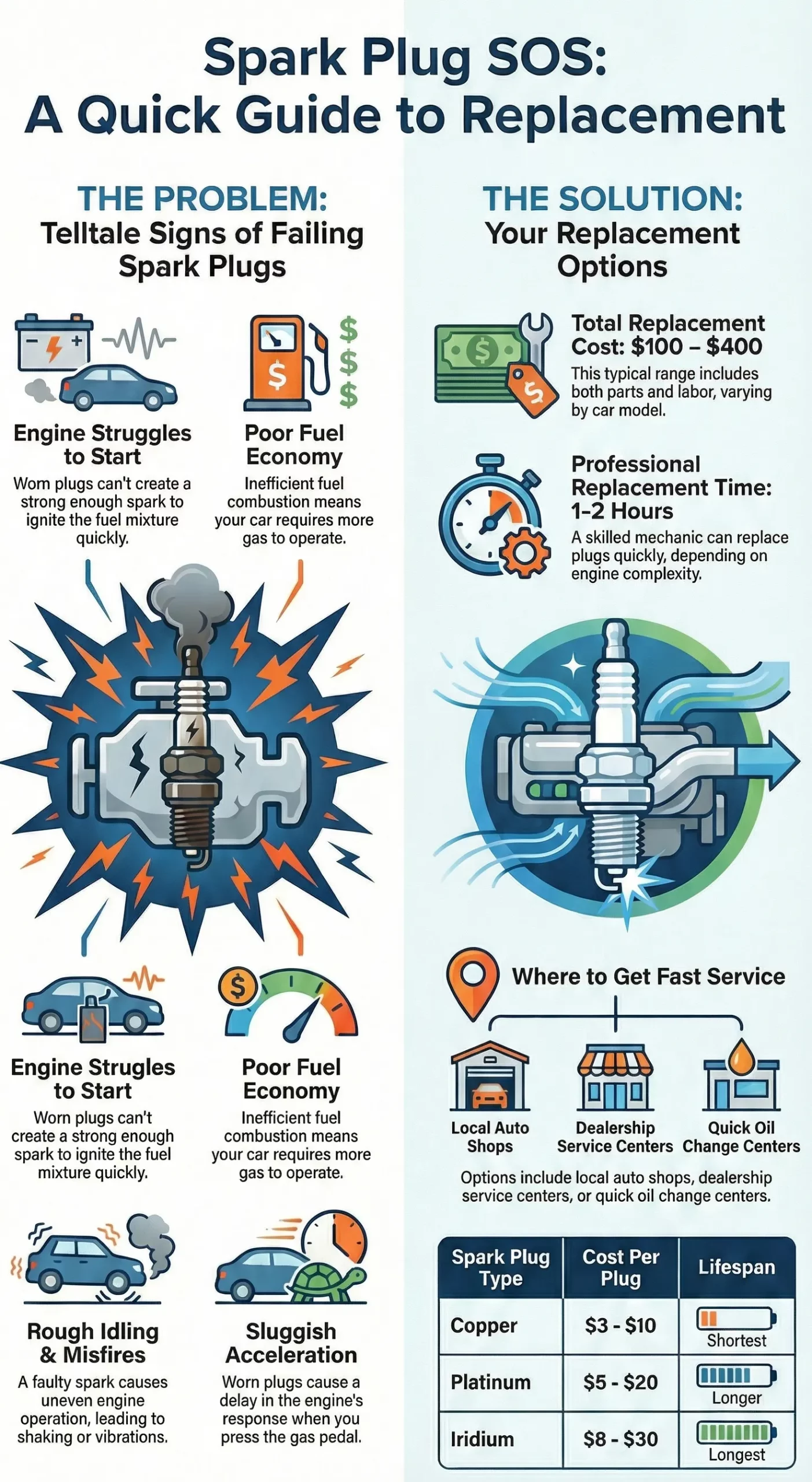 - Total Cost of Replacement: The total cost of replacing spark plugs, including parts and labor, typically ranges from $100 to $400, depending on the number of plugs, type of spark plugs, and the labor time required.